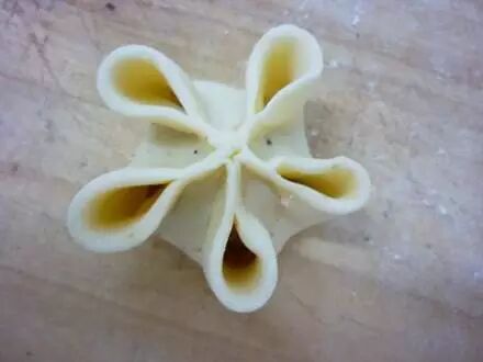把面团搓条,下剂子擀皮,包入馅心。把圆皮均分5点,粘在一起形成5条边,把口捏紧。