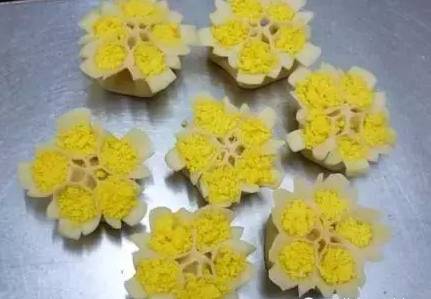 把熟蛋黄碾碎,放入花瓣中作点缀。