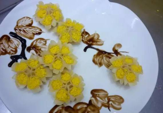 ⑤上面就是详细的包制手法,然后上锅蒸10分钟,出锅后点缀即可!记住颜色对比要鲜明而且不冲突啊~