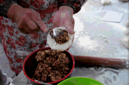 只见师傅麻利的拿出和好的面团,从中拽出一小块揉得圆圆的,在中间包上扎实的馅料,再捏紧成圆团。