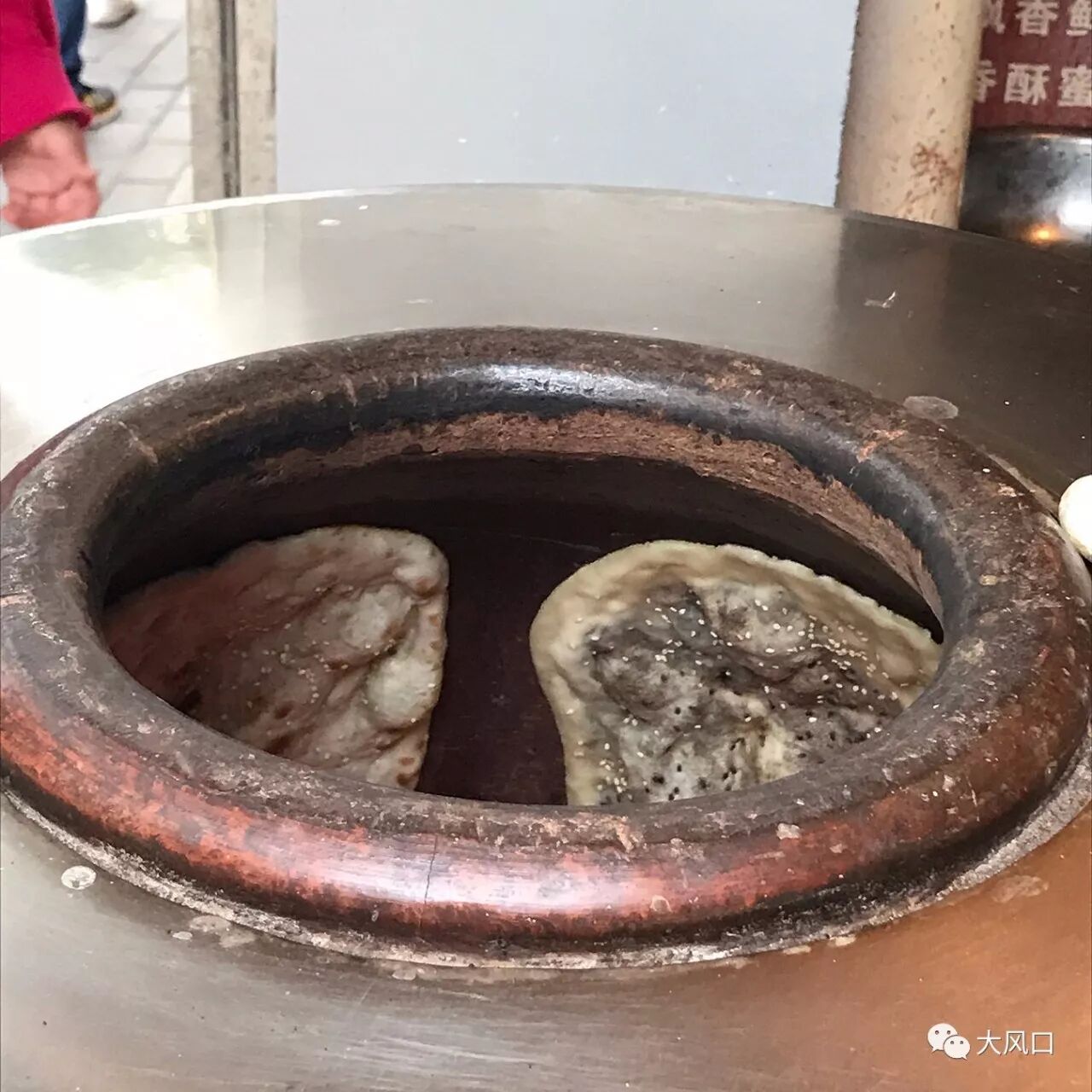 炉内的高温使得面饼在里面很快便被烫出了许多气泡,经过高温的持续烧灼,整个面饼开始慢慢的鼓了起来,表面呈金黄色,这时师傅拿起手中的钳子,手起钳落,迅速将锅盔从炉内拿出。