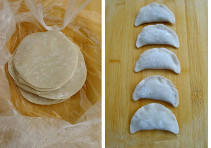 制作方法:面粉加入开水烫成面团,揉光搓条下剂子,擀成圆皮