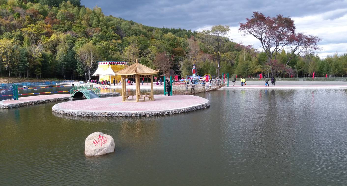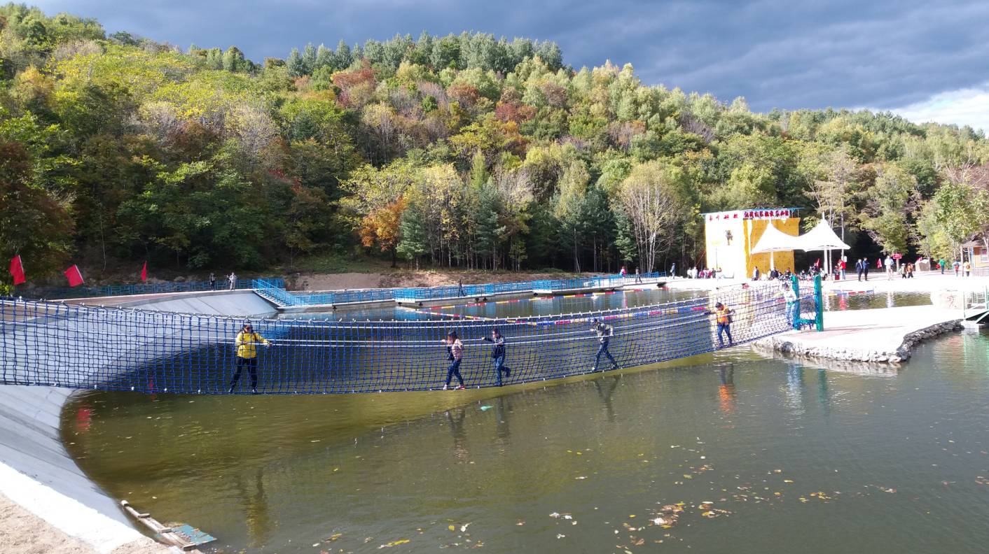 吃过午饭,坐着电瓶车一路飞驰进山,首先来到了野外拓展区,野外拓展区里有真人CS、疯狂斗牛、升降飞机、攀岩、遥控船等户外趣味运动。在河内梅花桩区域,踩着直径一米的圆木桩,把着摇摇晃晃的铁索,一步步艰难向前,到水中心位置时,木桩已经沉到水底,不得不沾水迈过,一个不小心就能“湿身”。终于安全到达终点,不知什么时候,手心脑门全是汗。