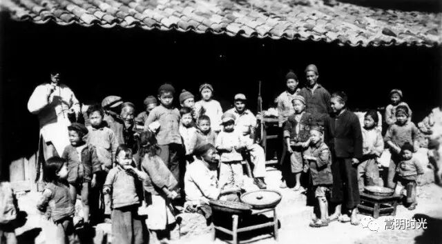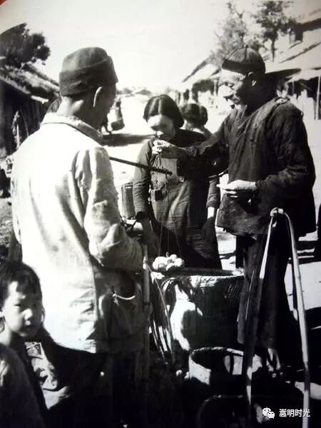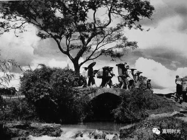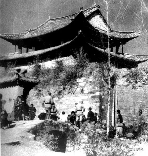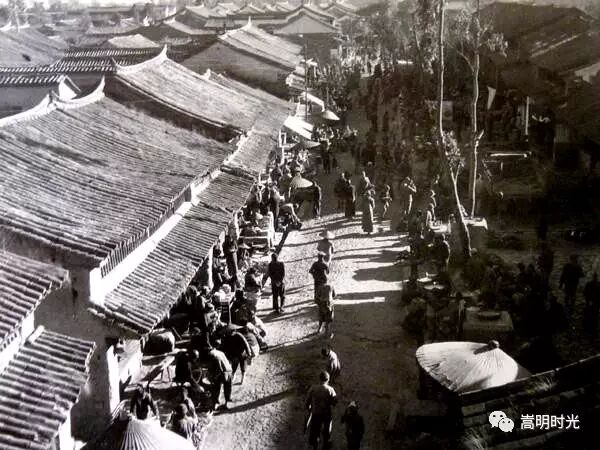 这是古城墙上的一隅,绿叶萦绕,芳草飘香,偶遇几家闲余,围坐一起,男人们大话生活趣事,女人们手织毛衣, 老人们逗乐小孩儿,怡然自得。 1940年的嵩明和中国的大多数的城市一样,被城墙所包围。城里很热闹,总是有各种各样的商业与社会活动。