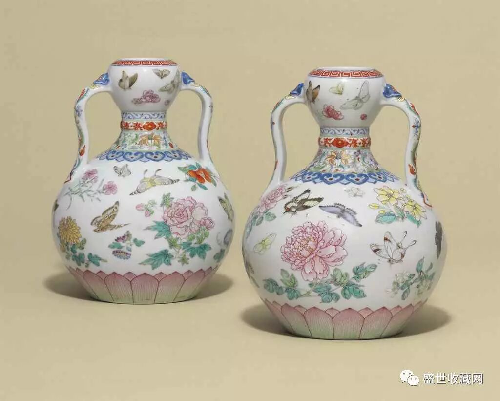 清乾隆粉彩花蝶纹如意耳葫芦尊一对,成交价14,725,000英镑