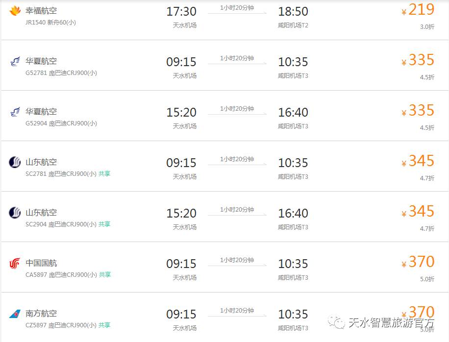 ②飞机:天水机场有到西安的直达飞机,机票约为200+左右,1小时20分即可到达咸阳机场,然后坐大巴到西安,时长约1小时,票价25元。