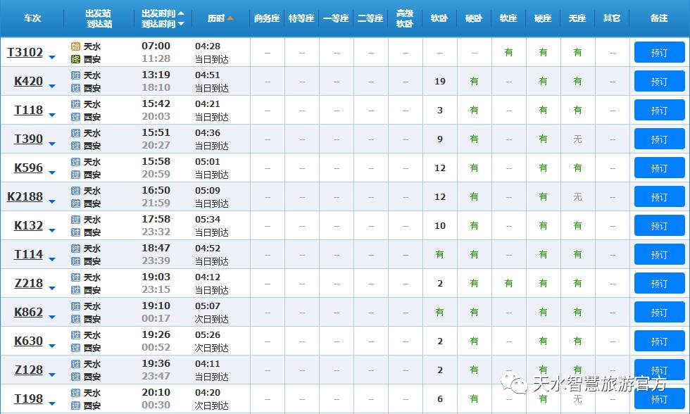 ①火车:天水到西安共有38趟列车,其中还有一趟始发列车,车程约为4个半小时,硬座车费为50.5元,硬卧96.5元。