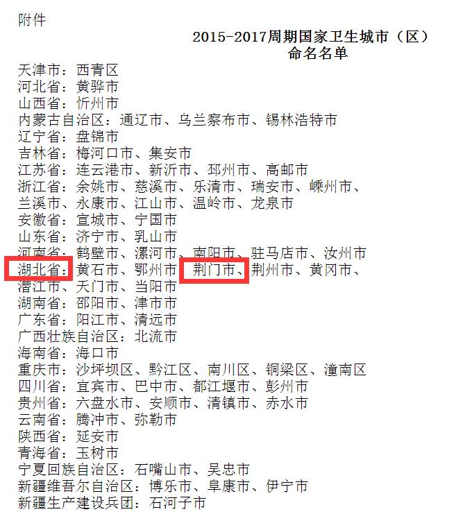 经天津市等25个省(区、市)爱卫会推荐,按照《国家卫生城市评审与管理办法》(全爱卫发〔2015〕4号),全国爱卫办组织专家对2015-2017周期申报创建国家卫生城市(区)的城市(区)进行了资料初审、暗访、技术评估和综合评审,并进行了社会公示。根据评审结果,全国爱卫会决定,命名天津市西青区等69个城市(区)为国家卫生城市(区)。湖北省八个城市(区)获此殊荣,分别是黄石市、鄂州市、荆门市、荆州市、黄冈市、潜江市、天门市、当阳市。