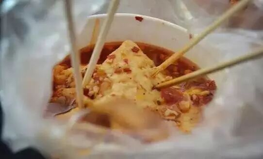男生女生边走边吃的臭豆腐