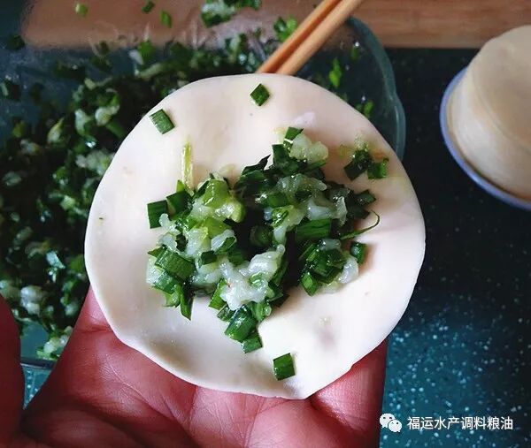 取一份饺皮放处适量磷虾韭菜馅