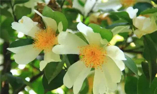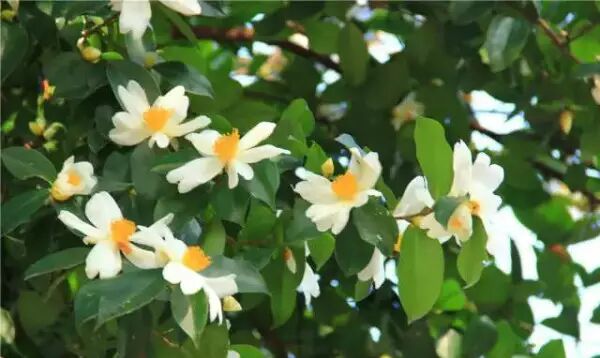 白花油茶的花朵,独有一份温婉可人、淡雅清新的别致,小小的一朵,缀满枝头,摇曳生姿,香气袭人。