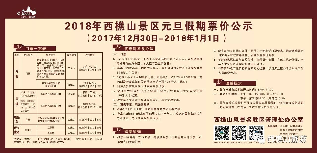 ▽西樵山元旦假期门票公示(2017年12月30日至2018年1月1日)
