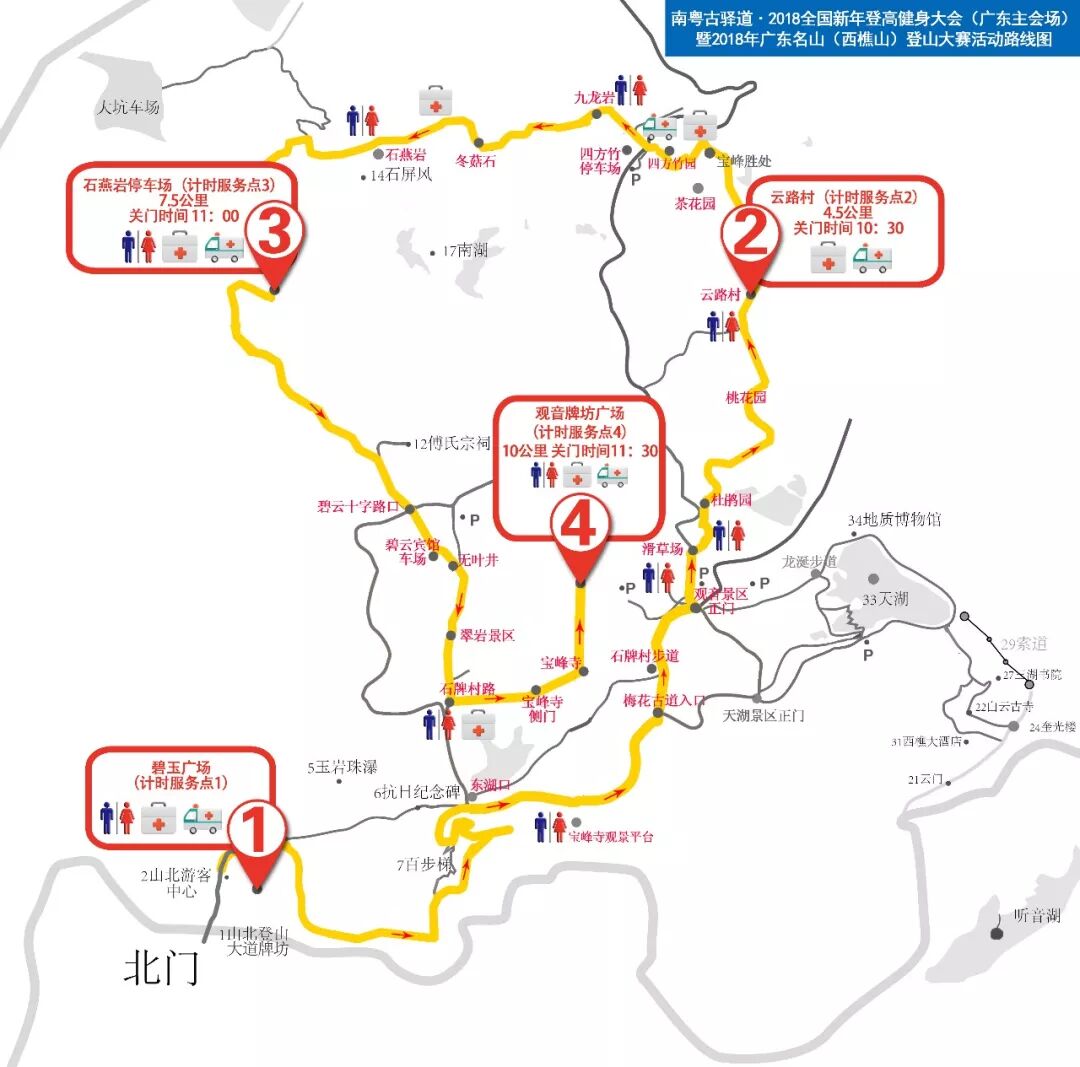 路线:西樵山北门碧玉广场(起点)→东湖口→石牌村步道→南海观音景区正门→滑草场→杜鹃园→桃花园→云路村(4.5Km,服务签到点,关门时间10:30)→茶花园→四方竹园→四方竹停车场→九龙岩→冬菇石→石燕岩→石燕岩停车场(7.5Km,服务签到点,关门时间11:00)→碧云十字路口→碧云宾馆停车场→无叶井→翠岩景区→石牌村路→宝峰寺侧门→宝峰寺→南海观音牌坊广场(10Km,终点,关门时间11:30)