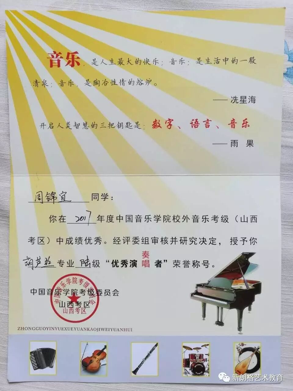 我叫周锦宜,今年10岁,小学五年级,从小爱好画画,捏手工,仰慕钢琴,三年级开始学习葫芦丝,坚持一年后四年级开始学习钢琴,在学习的过程中,我仿佛找到了自己,找到了自己在音乐世界的道路,也许很多学生一路走来,会觉得学习乐器很枯燥,但是我只想说每次的突破,每次的进步,都让我继续努力,不断的向前,做任何事情,只要是自己喜欢的就一定要珍惜,一定要坚持!
