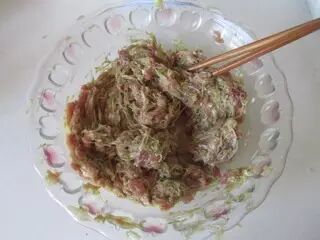 将西葫芦擦成细丝,加入适量的盐, 腌制一下,挤出其中大部分的水分,放入肉馅中, 再加入适量的香油,再顺着刚才的方向搅拌均匀。