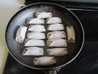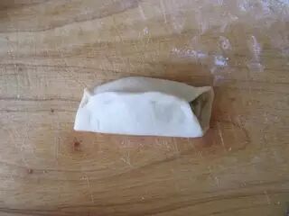 将饧好的面团揪成大小相同的剂子,擀成圆片后中间包入西葫芦肉馅,将上面捏紧, 两边不必封口,同样的方法将其他的锅贴包好备用。