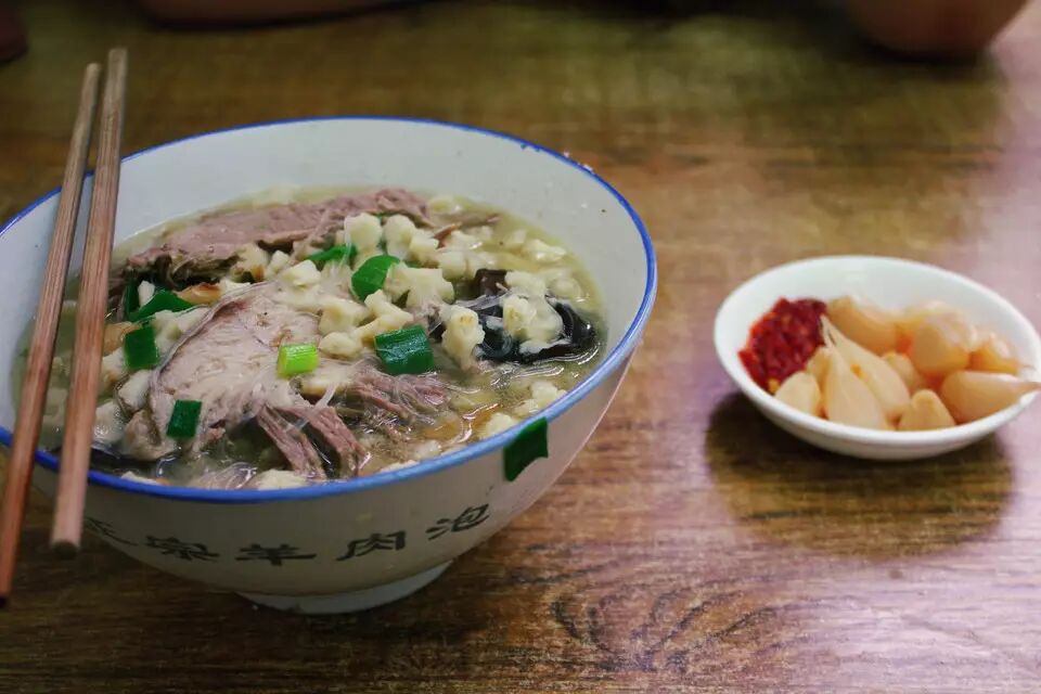 最出名的当然是羊肉泡馍。据当地朋友说,声名在外的那几家老字号没必要去,特地给我介绍了另一家。西北人就是实在,盛羊肉用海碗,能把脸都埋进去。西安的朋友说:“着算啥啊,换陕北那边跟斗一样大。”