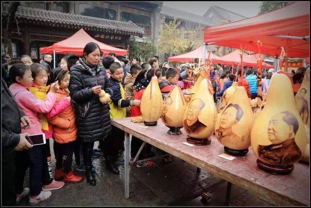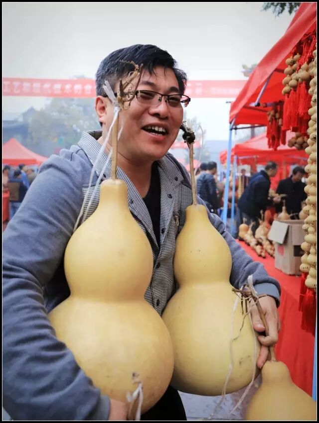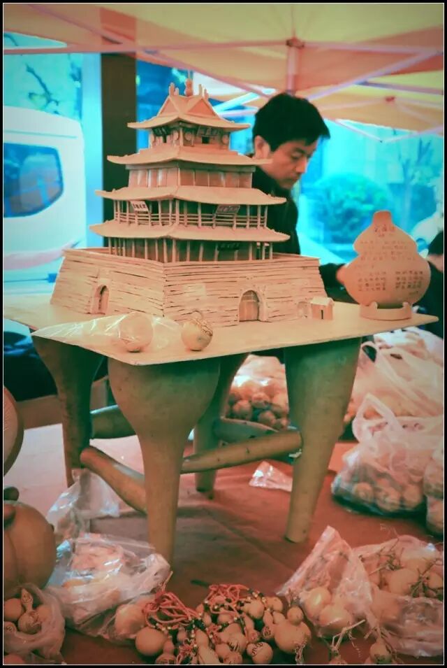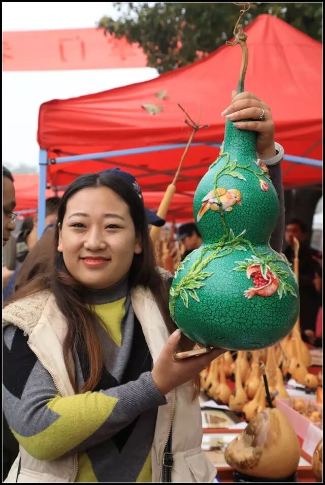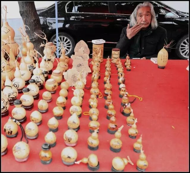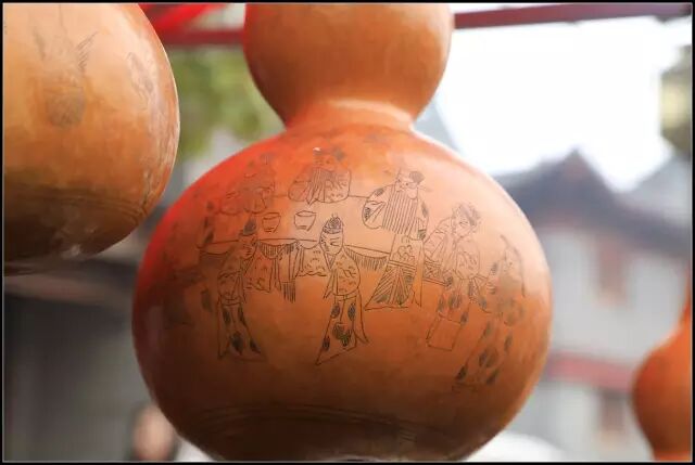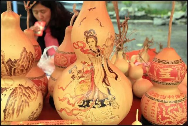 葫芦节上众多的展品分列在古城的道路两旁。葫芦作品琳琅满目,千奇百怪。有小巧玲珑的袖珍葫芦、养身保健的葫芦灸、工艺精妙的雕刻、烙画葫芦、造型奇特的油锤葫芦,还有形式多样的葫芦台灯,可谓是应有尽有。
