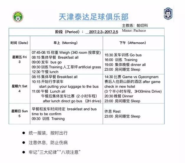 值得一提的是,明天下午的比赛过后,天津泰达队将入住蔚山新的酒店,为球队提供更好的训练场地和训练环境,争取让球员们尽快进入到冲刺阶段的备战状态。