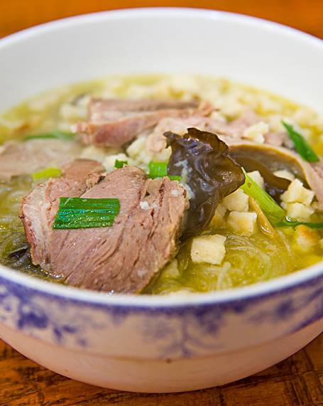 大名鼎鼎的羊肉泡馍是采用牛羊肉汤和煮好的肉与掰碎的饦饦馍进行烹制,料重味醇,肉烂汤浓,香气四溢。你可以将馍一点一点掰得细碎丢进汤里,享受羊汤泡馍的滋味,或者一口汤一口饼,再夹大块的羊肉慢慢咀嚼,吸溜两口粉丝,那感觉棒棒哒!