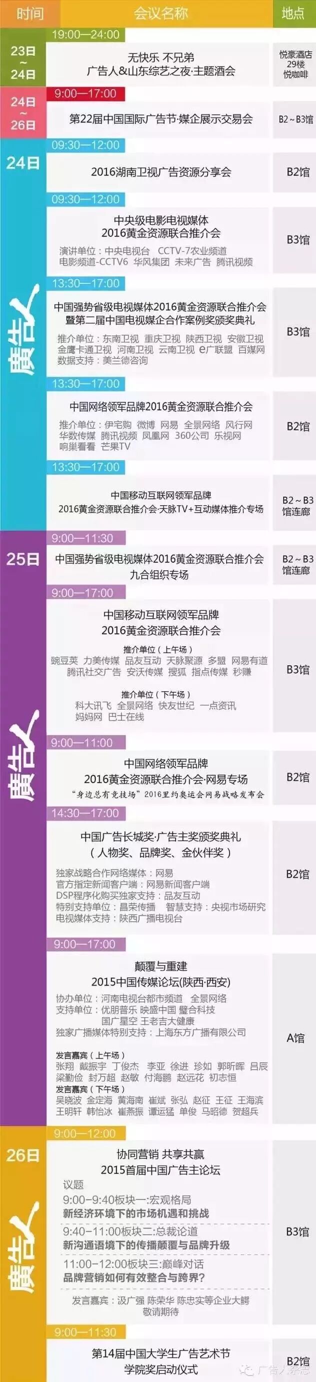 上表是西安广告节的行程大放送!各位同学可要好好筹划你的空中飞人行动了!考虑到10个人中可能就有10个人不知如何分身去这么多的会议,体贴的小编已经为您甄选了一些极具代表性的媒体会议,一招KO选择困难症。