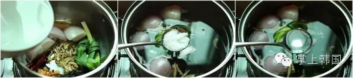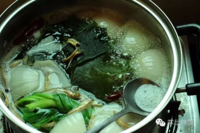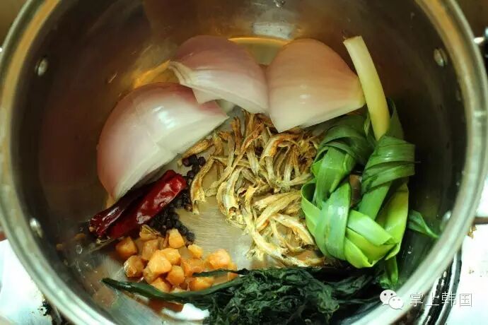 材料:清水3L,盐1勺,洋葱半个,干辣椒2个,10厘米见方的海带一张,干贝10g,鳀鱼10g,清酒2大勺,新鲜大蒜1根,胡椒粒1勺