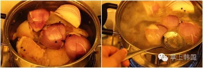 4、加入3L清水,大火烧开以后,用勺子撇去浮沫,并加入1勺盐,用小火慢炖3个小时