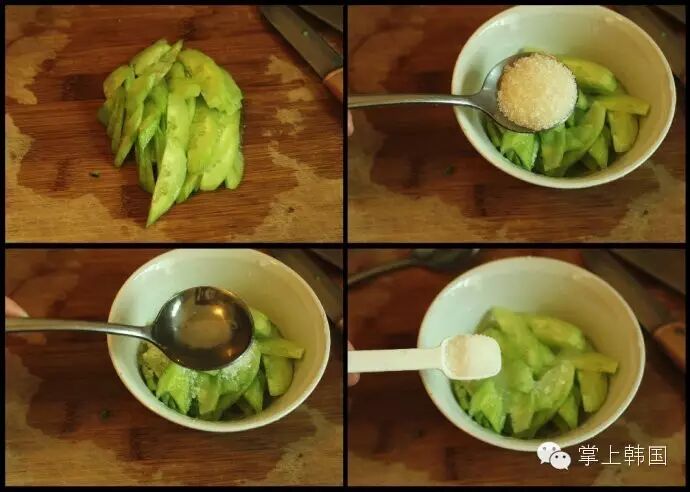 2、青瓜对半切开以后切薄片,加1勺白糖,1茶匙盐,1勺米醋,腌制20分钟,腌制完以后挤干汁水,汁水留着制作冷面汤的时候用