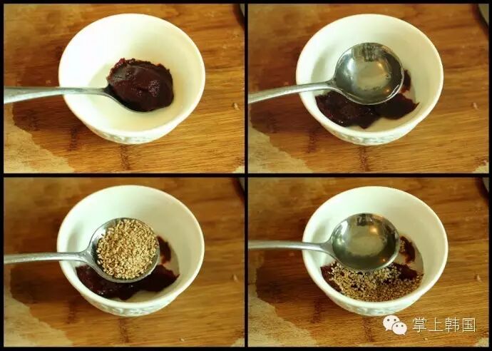 3、在碗中加入韩国辣酱1勺,糖稀1勺,炒香白芝麻1勺,米醋1勺,搅拌均匀成醋辣酱(或是用1勺芥末酱,3勺米醋,3勺白糖,1茶匙盐调制成芥末汁)