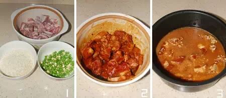 3.腌过的排骨和洗净的米入电饭煲,加水后煮(可以比平时煮饭时少加一些水,我觉得这样的米饭稍硬些才好吃,不过我家有小朋友,所以我还是煮的比较软)