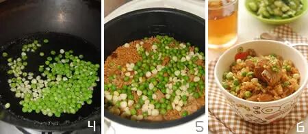 5.排骨饭煮好后,开盖把青豆和玉米到在米饭上,再盖上盖子焖几分钟,让米饭和青豆,玉米的味道更融合
