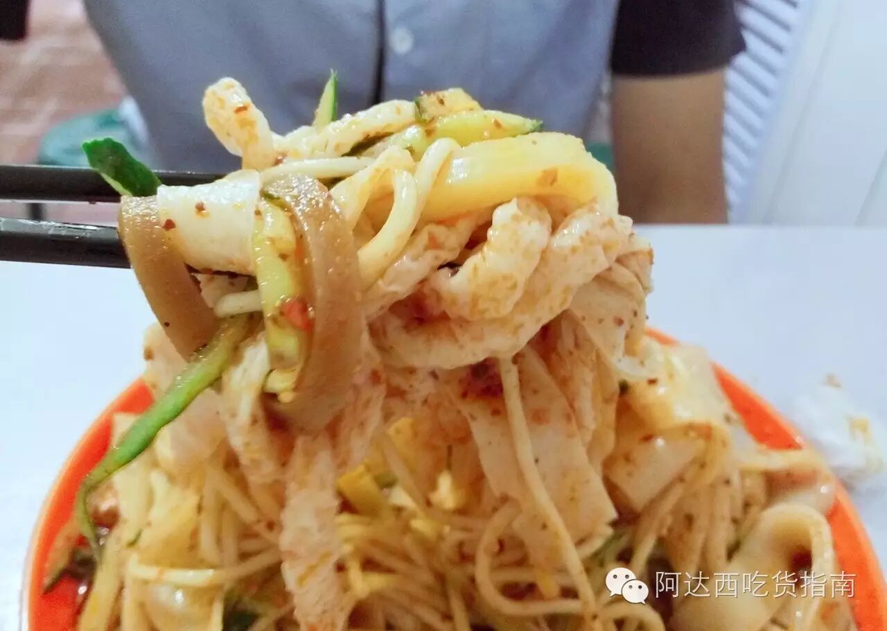 陕西凉皮不同于新疆本地回民的凉皮(点击查看往期内容:新疆这家老店明星多,李亚鹏王菲都去过!)在吃货君看来,新疆本地回民所说的凉皮可能更接近于酿皮,两者在面皮的劲道、酱料的浓郁和层次感上可以说是各有千秋。追求绵软爽口和层次感的吃货们可以各取所需。![]()