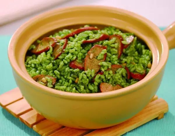 食材:培根、盐水方肉、松仁、菠菜、大米、盐,鸡精、植物油。