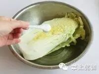1、 将大白菜切成两半或四半,洗净后,每片菜叶均匀的抹上盐,放置一边,大约半天的时间