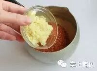 5、 将晾好的糯米糊倒入盆内,加入虾米(或虾酱或鱼露),辣椒粉,糖稀(没有糖稀可不放),搅拌均匀,如果太稠可加少量凉白开