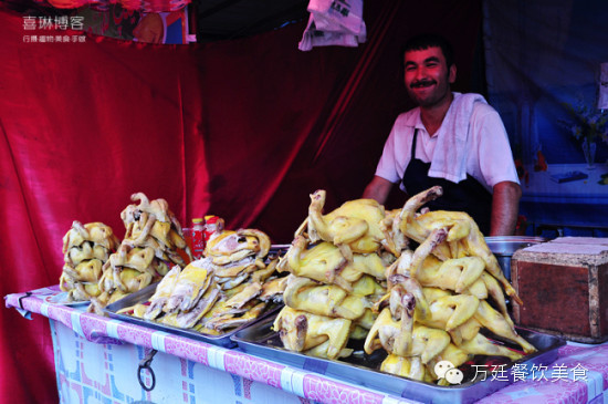 烤鸡的摊位也是一家挨着一家。烤鸡还这么火爆,后来一问原来是馕坑烤鸡。馕坑烤鸡用的是当地土鸡,整个烤鸡看起来油光鲜亮、又肥又嫩。