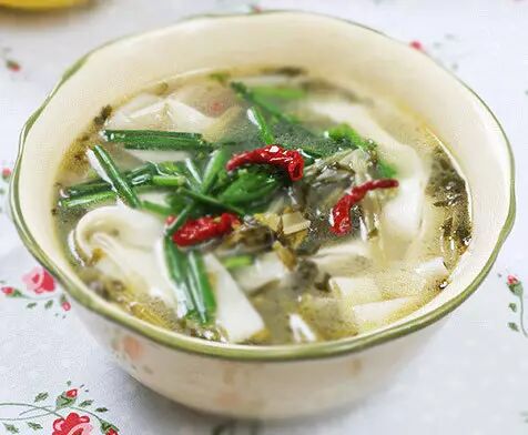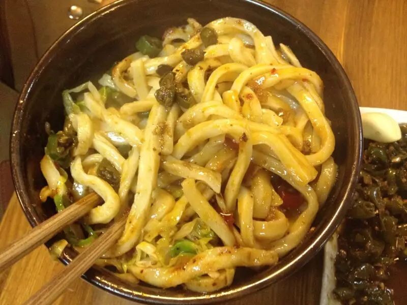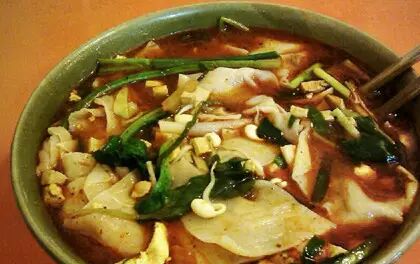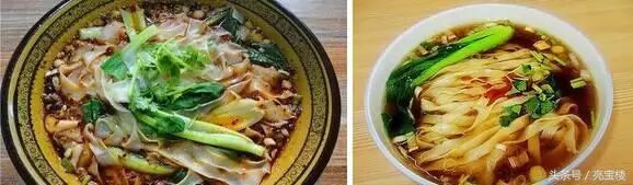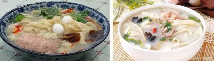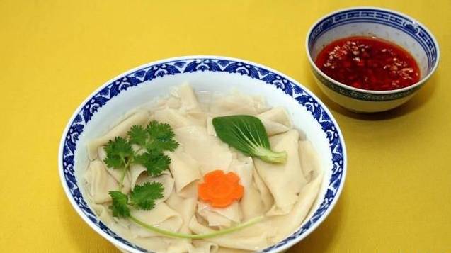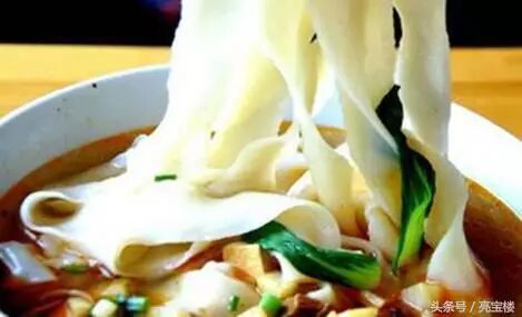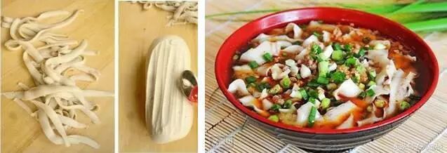 汉中风味食品,将很薄的面片切成1-3厘米宽的面条。汤里加酱油、醋、盐、辣椒油、胡椒粉、葱花,最后加少许猪油。