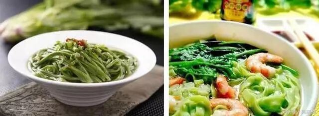 即菠菜面,绿色的面条辅以笋丝、鸡丝、火腿、青菜等彩色“浇头”,色彩鲜艳,味道可口。