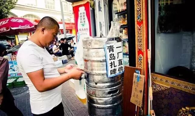 青岛特有的袋装青岛啤酒,不同于瓶装啤酒,袋装啤酒是鲜啤酒 ,味道不同,包装是大的密封桶往里打气通过压力出来,现买现打。