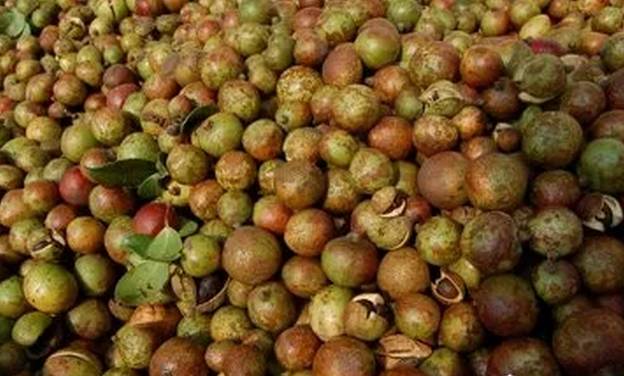 油茶果都是不规则的椭圆形,有绿色的、也有红色的,以红绿相间者居多。一般来说,长在树荫中的,便是绿色;长在向阳的地方没有被荫住的,便是红色。无论茶果是红还是绿,但里面的茶籽,都是统一的黑色,黑得油光发亮。黑色的茶籽壳非常坚硬,但里面的肉则很是柔软,淡淡黄黄、透着芳香灵气。
