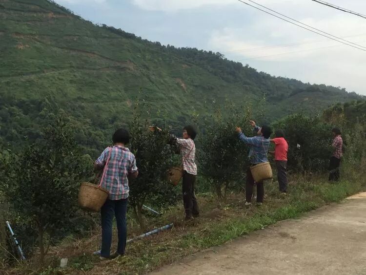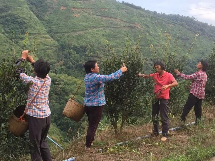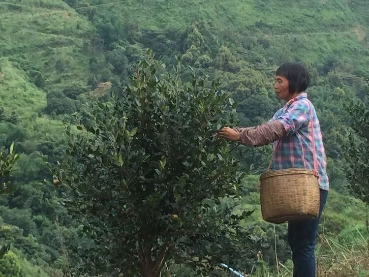 秋风萧瑟,草木枯黄。来到江屯撑高岭,只见累累果实的油茶树满布山坡,从山脚到山顶,一排排依山次第环绕。从高处俯瞰,颇像一个个队列整齐的哨兵,用一年四季的青绿守卫着大山的逶迤磅礴。日头渐渐爬上山腰,林中斑斓的色彩也因此显得时而清晰,时而浓烈,时而绰约,时而柔和,油茶树正像那秀外慧中的女子,妩媚不失庄严,热情不失内敛,莞尔一笑间,令无数人为之陶醉。一米多高的白花油茶树挂满了青褐色的油茶果,有的簇拥在枝头迎风引吭;有的果实已经笑开了嘴,油茶籽吐出壳外悬挂着,甚至或者颗粒已散落在树下的草丛中。一群村民三五结群,穿着布鞋,背着小箩筐,戴着手袜,用剪刀摘下成熟的油茶果。摘取的过程中,有说有笑,丰收的喜悦绽放在他们的笑颜之中,山坡回荡着乐此不彼的笑声。
