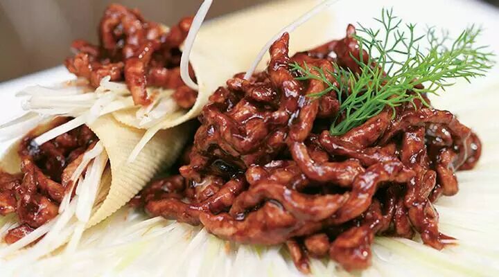 京酱肉丝是一道色香味俱全的汉族名菜,属于东北菜或北京菜。此菜咸甜适中,酱香浓郁,用北方特有烹调技法“六爆”之一的“酱爆”烹制而成。食用时辅以葱丝、腐皮,别有一番风味。