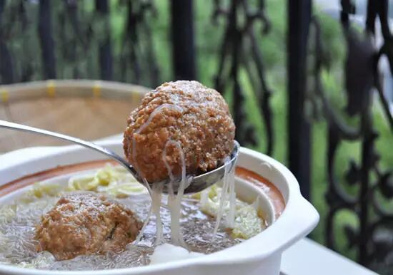 所谓“狮子头”,用扬州话说是大劗肉,普通话就是大肉丸子,但肉里面还有螃蟹肉、蟹黄、猪肉、调料,下面再垫上青菜心,上笼焖。用扬州人的话说:“猪肉肥嫩,蟹粉鲜香,菜心酥烂”,须用调羹舀食,食后清香满口,齿颊留芳,令人久久不能忘怀。