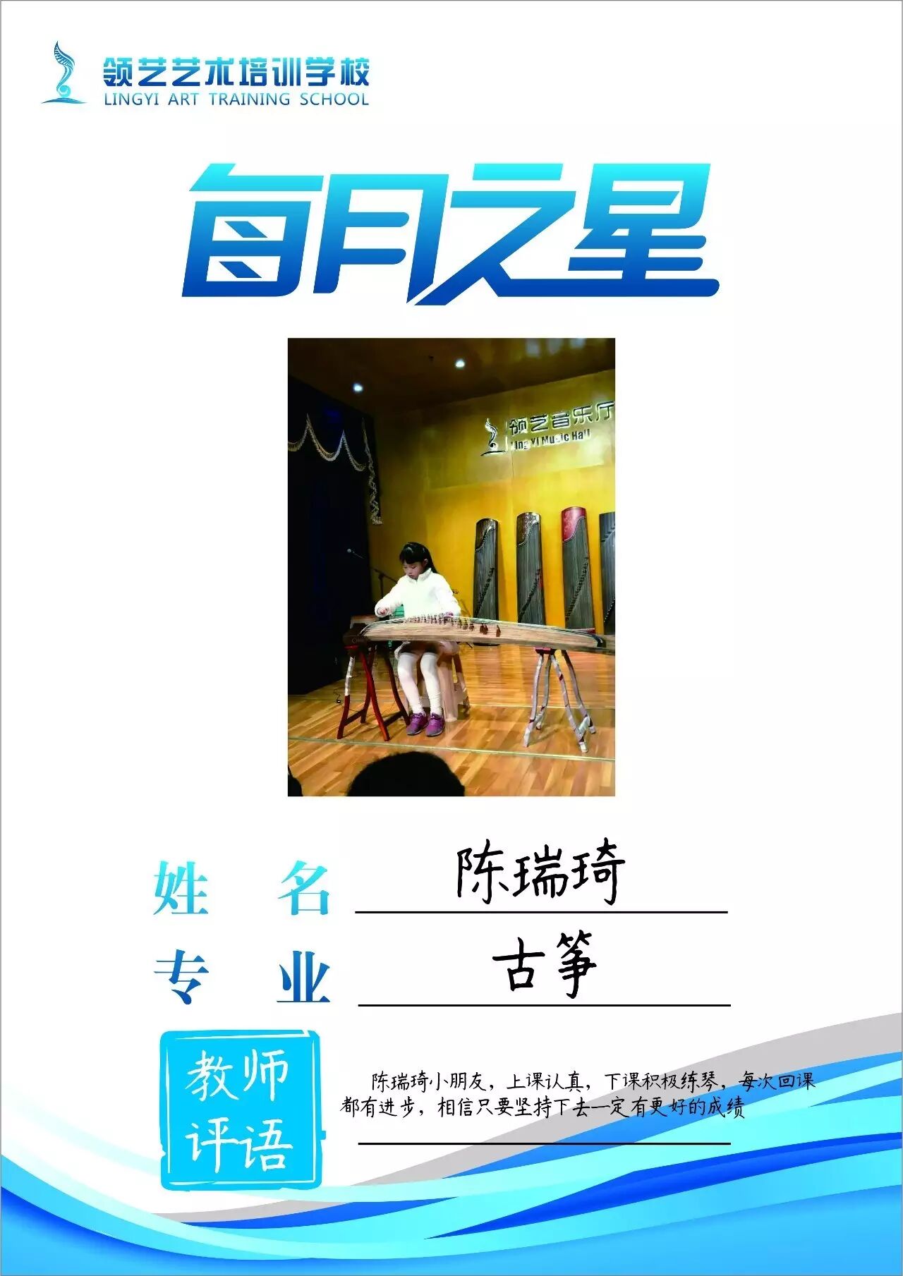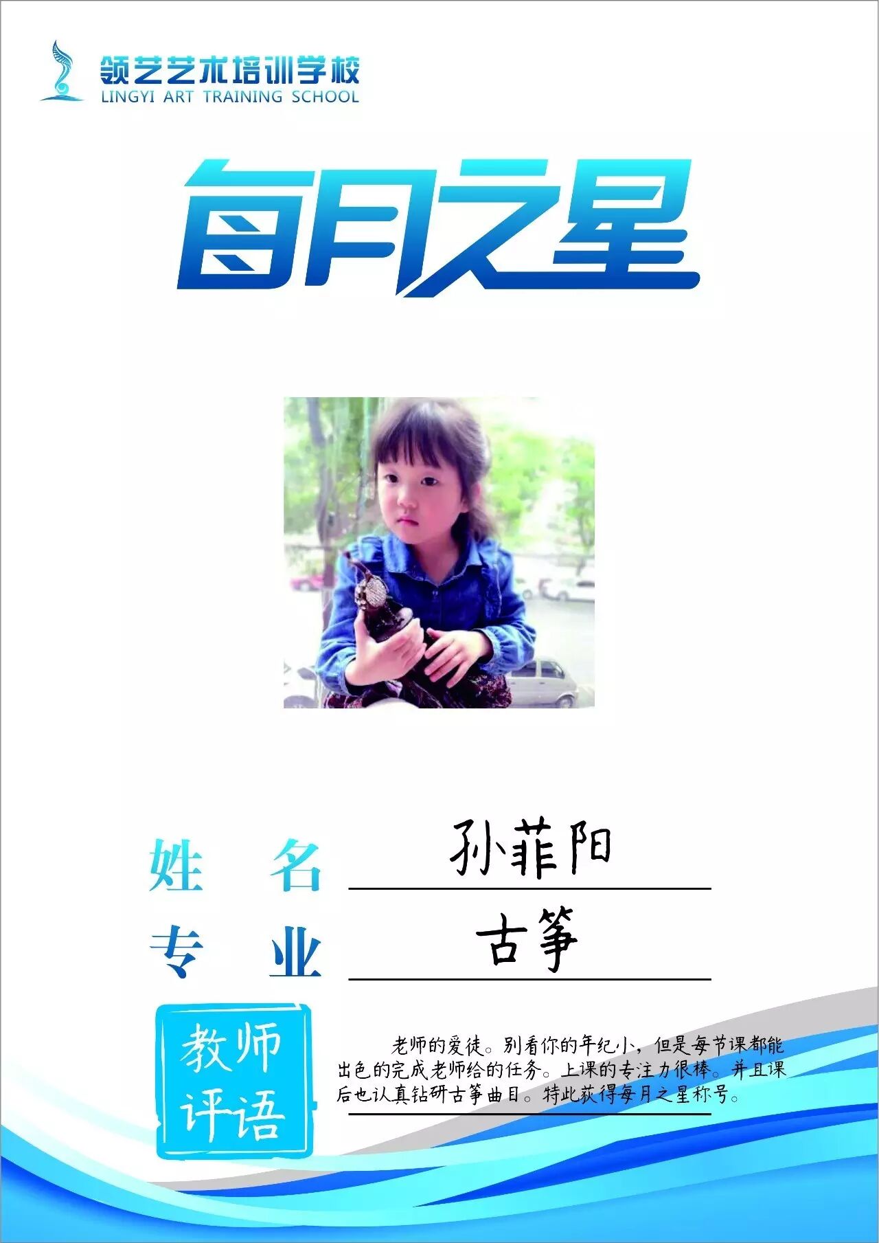 教师评语:孙菲阳,五岁,老师的爱徒。别看你的年纪小,但是每节课都能出色的完成老师给的任务。上课的专注力很棒。并且课后也认真钻研古筝曲目。特此获得每月之星称号。