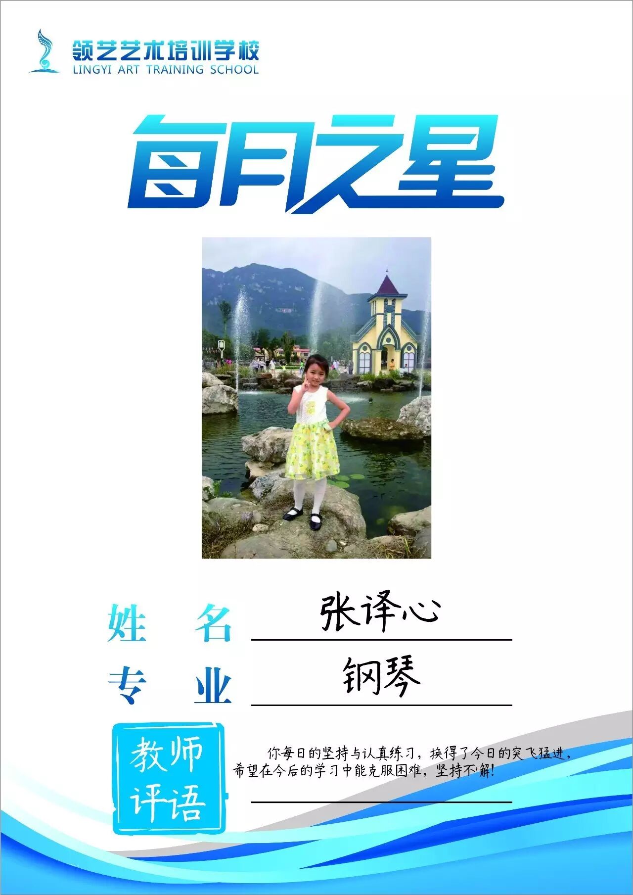 教师评语:张译心,你每日的坚持与认真练习,换得了今日的突飞猛进,希望在今后的学习中能克服困难,坚持不懈!