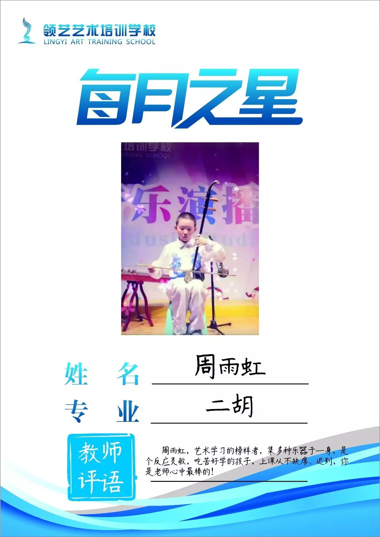 教师评语:周雨虹,艺术学习的榜样者,集多种乐器于一身,是个反应灵敏,吃苦好学的孩子,上课从不缺席、迟到,你是老师心中最棒的!