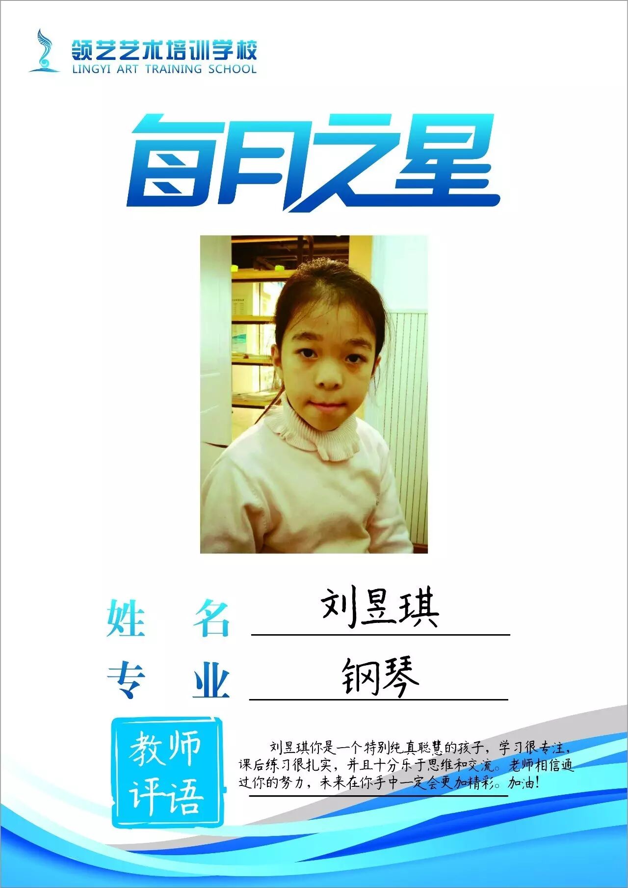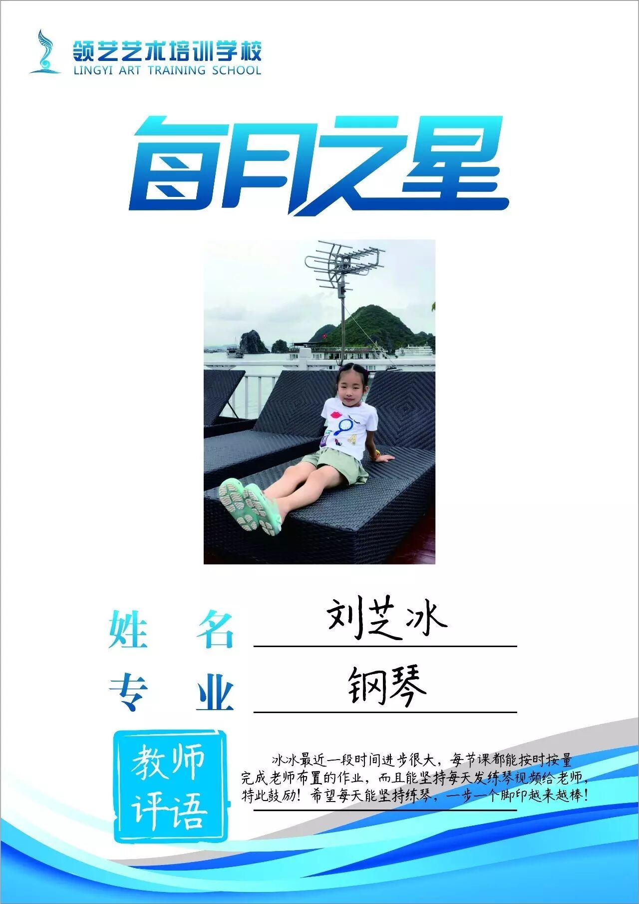 教师评语:刘芝冰。冰冰最近一段时间进步很大,每节课都能按时按量完成老师布置的作业,而且能坚持每天发练琴视频给老师,特此鼓励!希望每天能坚持练琴,一步一个脚印越来越棒!