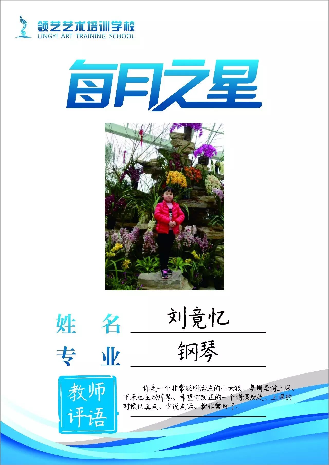 教师评语:刘竟忆,你是一个非常聪明活泼的小女孩、每周坚持上课、下来也主动练琴、希望你改正的一个错误就是、上课的时候认真点、少说点话、就非常好了。