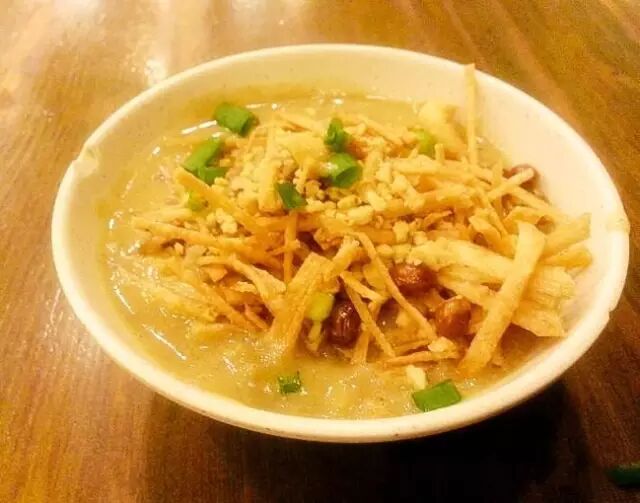 馓子多数是配着油茶来吃。脆生生的馓子裹上了米糊、榨菜和花生,一口下去,迸发在嘴里的味道相当令人惊艳~