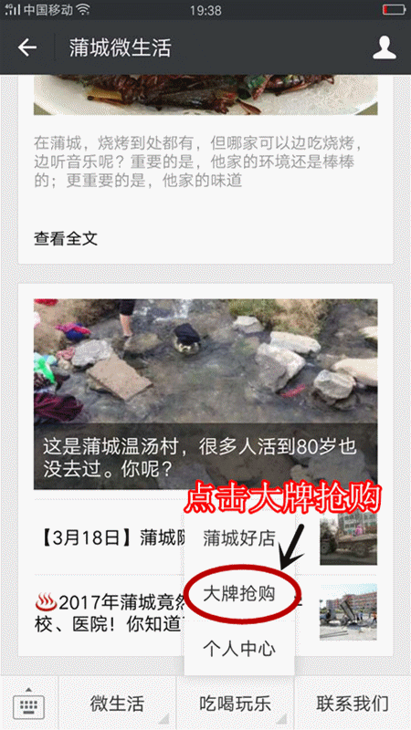 2.点击【蒲城微生活】微信公众号底部导航菜单【吃喝玩乐】,再点【大牌抢购】进入抢购。